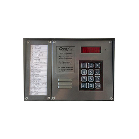 Digitális kaputelefon központ 1 oszlopos névtáblával A központ főbb jellemzői Mikroprocesszoros vezérlő elektronika. Optikai szenzoros, érintőbillentyűzet. 4 db hétszegmenses LED kijelző. Maximum 255 lakáskészülék csatlakoztatható. 2 vezetékes, buszos rendszerű lakáskészülék csatlakoztatás. Minden lakáshoz kapunyitó kód programozható. Lakásonként előre definiált kódok (megváltoztathatók). Lakásszám figyelés. Postáskód kiadható. Pro