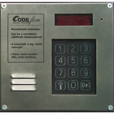 Digitális kaputelefon központ maximum 255 lakáshoz, névtábla nélkül A központ főbb jellemzői Mikroprocesszoros vezérlő elektronika. Optikai szenzoros, érintőbillentyűzet. 4 db hétszegmenses LED kijelző. Maximum 255 lakáskészülék csatlakoztatható. 2 vezetékes, buszos rendszerű lakáskészülék csatlakoztatás. Minden lakáshoz kapunyitó kód programozható. Lakásonként előre definiált kódok (megváltoztathatók). Lakásszám figyelés. Postáskód