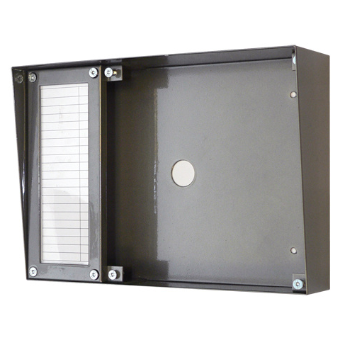 Kültéri ház EVKT digitális kaputelefon-központokhoz 1 oszlopos névtáblával A ház főbb jellemzői Kültéri ház EVKT, digitális telefonközpontokhoz. 1 oszlopos, cserélhető névtábla. Átlátszó plexi előlap. Falon kívül telepíthető. Vízszintes elrendezésű. Méretei: 260 x185 x 70 mm.