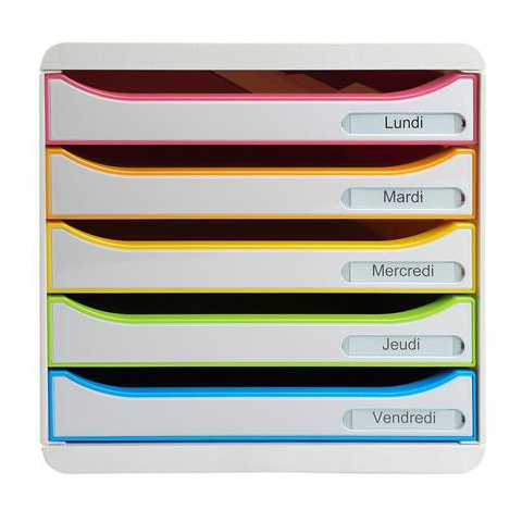 Csillogó vidám színekben pompázó irattároló! -áttetsző feliratozó ablakokkal és cserélhető betétcímkékkel -5 fiók A4+-s dokumentumokhoz -fekvő tájolás -méret: 347 x 278 x 271 mm -rakásolható -25 év garancia