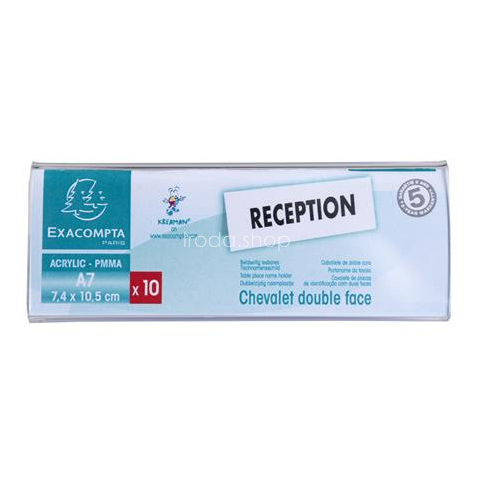 Névtábla tartó, asztali, A7, EXACOMPTA Névtartó tábla kiváló kiegészítője az asztalnak! -fekvő tájolású -mindkét oldalról olvasható -minőségi akrilból készült -UV álló, nem sárguló anyag -a névtábla kiterített mérete: 110 x 40 x 100 mm -kiszerelés: 10
