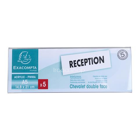Névtábla tartó, asztali, A5, EXACOMPTA Névtartó tábla, A5-ös méretben! -fekvő tájolású -mindkét oldalról olvasható -minőségi akrilból készült -UV álló, nem sárguló anyag -a névtábla kiterített mérete: 210 x 60 x 170 mm -kiszerelés: 5 db/csomag -garanc