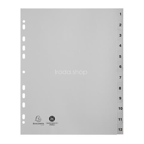 Regiszter, műanyag, A4+, 1-12, EXACOMPTA, szürke Újrahasznosított 0,12 mm vastag PP-ből készült -méret: A4+ -12 részes -1-12 felirattal rendelkező regiszter lapok -előlyukasztott lefűzőrész -12 különböző színű fül a könnyű rendszerezéshez