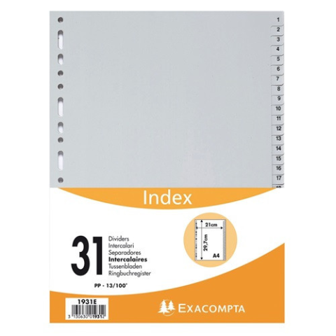 Regiszter PP Exacompta A/4 1-31-ig szürke Méret: A/4Kiváló minőségű szürke, műanyag regiszterekAlapanyag: 120 mikronos műanyagElőre lyukasztott, így lefűzhető mappába vagy dossziéba
