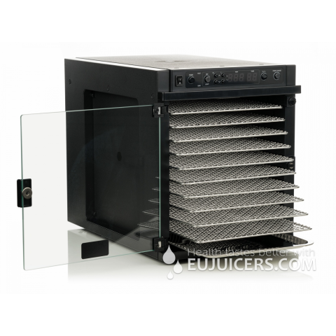 Élelmiszer szárító-aszaló 0,92 m2 szárító felülettel és rozsdamentes acél tálcákkal (fekete, 11 tálca, időzítő).