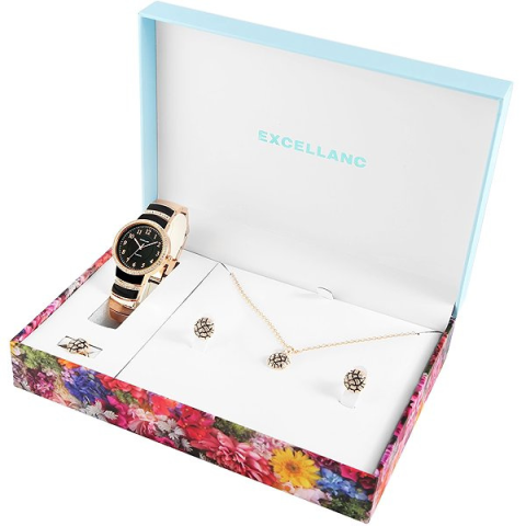 Óra ajándékcsomag - női, analóg idő megjelenítés, kerek számlap, arab indexek, tok anyaga ötvözet, tok színe rózsaarany, szíj színe rózsaarany, nyaklánc, fülbevaló és gyűrű szintén a csomagban