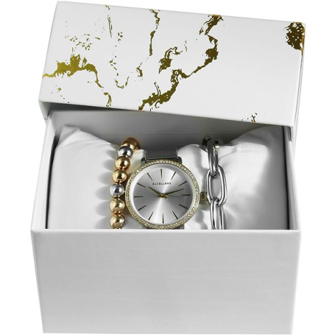 Óra ajándékcsomag - női, analóg idő megjelenítés, kerek számlap, elegáns, számozás nélküli, tok anyaga ötvözet, tok színe ezüst és arany, szíj színe ezüst, karkötő szintén a csomagban E praktikus EXCELLANC 1800239-003 egy olyan óra, ami soha nem fog cserben hagyni. A szíj hosszát könnyedén beállíthatod a csuklód kerületének megfelelően. Az analóg óra egy összetéveszthetetlen klassz