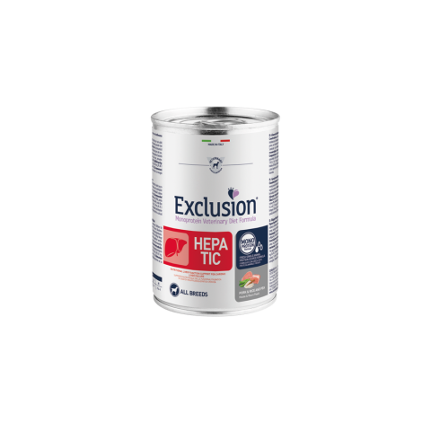 1 kép Exclusion Hepatic Pork & Rice & Pea Canned 400g kutyaeledel termékleírás