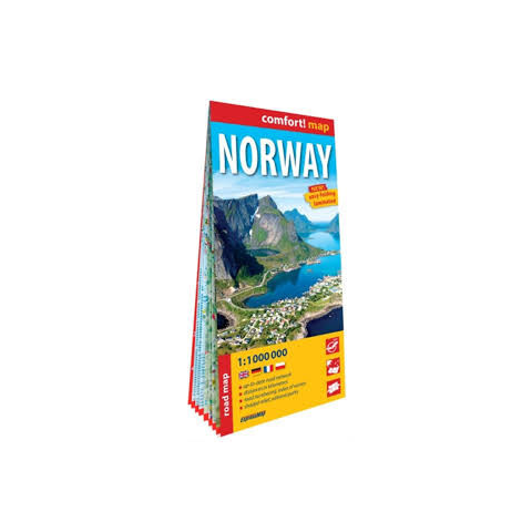 Norvégia térkép. Norvégia autótérképe. Norvégia 1:1 000 000 méretarányú laminált autótérképe. Tartalom: - 2018-as úthálózat, építés alatt álló útszakaszok - közúti távolságok kilométerben - kompok, nemzetközi repülőterek - nemzeti parkok, természetvédelm