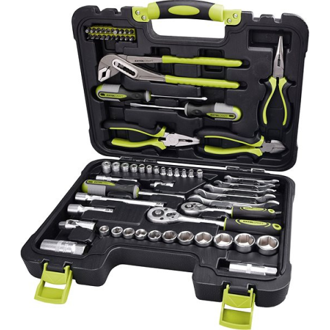 Szerszámkészlet - 65 db, anyaga CrV, a racsni mérete: 1/4", 3/8", tartalma: kulcsok, fogók, csavarhúzók, műanyag bőrönd A kiváló EXTOL CRAFT 6598 szerszámkészlet mindenféle munkára és javításra alkalmas. Ezzel a 65 db-os készlettel mindig a kezed ügyében lesz a szükséges szerszám. Minden szerszám kiváló minőségű CrV ac
