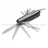 11 különböző szerszám, többek között fűrész, csavarhúzó, nyitó, kés, olló, és reszelő része ennek a bicskának..Fém és műanyag kombinálásával készült zsebkés markolata.