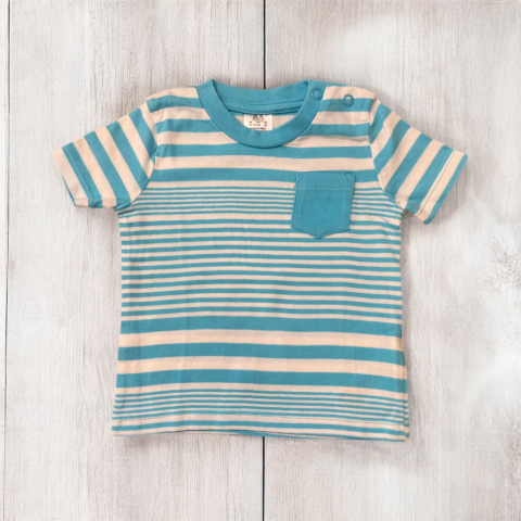 Türkiz csíkos póló Egyenes szabású, kerek nyakkivágású, vállnál patentos. Hibátlan állapotú.