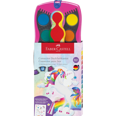 Vízfesték, 12 darabos, összeilleszthető, csillámmal és matricával, FABER-CASTELL, unikornis