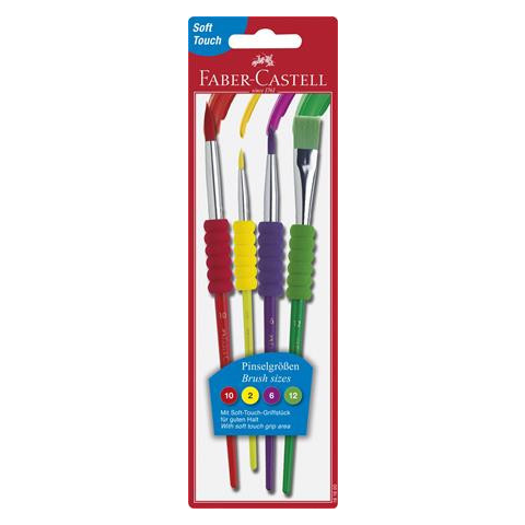 Ecsetkészlet, no. 2-6-10-12, FABER-CASTELL Élénk színű habszivacs markolatrész a kényelmes fogás érdekében -szintetikus ecsetszőr -a no. 2-6-10 méret kerek -a no. 12 méret lapos Gyártó/első EU forgalmazó elérhetősége: A.W. Faber-Castell Vertrieb Gmb