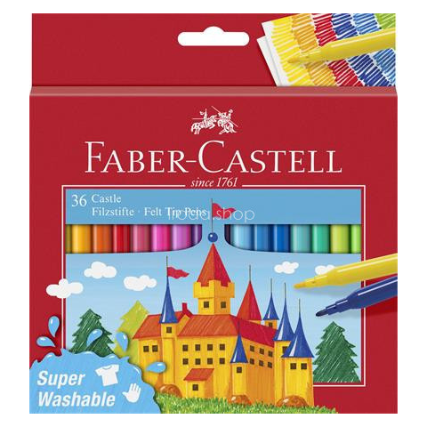 Filctoll készlet, FABER-CASTELL, 36 különböző szín Castle Élénk színű filctoll, kiváló minőségű, szálkásodásmentesen heggyel -vízbázisú tinta -mérgező anyagot nem tartalmaz -szinte minden textíliából könnyen 30° C fokon kimosható - használható: papír