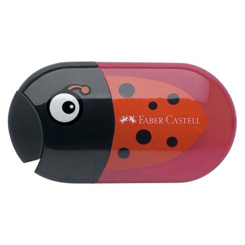 Hegyező és radír, kétlyukú, tartályos, FABER-CASTELL, katicabogár minta alkalmas normál és jumbo méretű grafit és színes ceruzák hegyezésére biztonsági csavarral beépített radír Gyártó/első EU forgalmazó elérhetősége: A.W. Faber-Castell Vertrieb GmbH