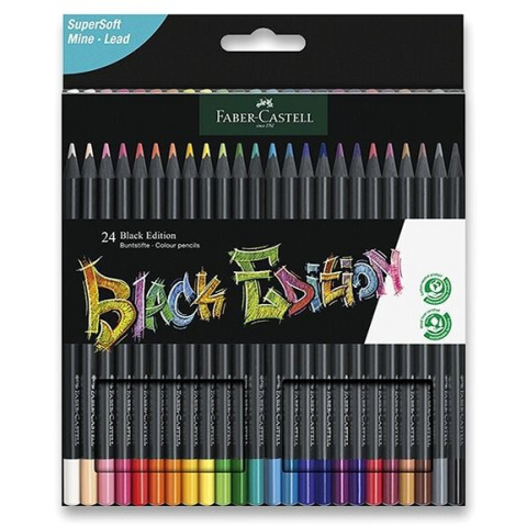 Színes ceruza Faber-Castell - lemosható és törhetetlen, háromszögű, jobb- és balkezes, ergonomikus markolat, papír felületekre, hagyományos színek, puha ceruzabél, papír csomagolás, 24 ceruza a csomagban Faber-Castell Black Edition színes ceruzákSzeretnéd, ha több rajzeszközöd lenne? A fém dobozba csomagolt színes ceruzák biztosan örömet okoznak majd a tehetséges, művészi vénával rendelkező gyerekekne