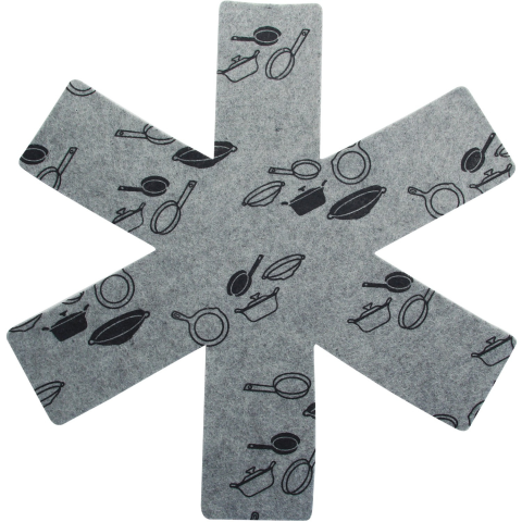 A Fackelmann edény- és serpenyővédővel megvédheti serpenyőinek és lábasainak bevonatát, amikor egymásba helyezi azokat. Szintetikus filcből készült, átmérője 38 cm. A csomaghoz két darab, szürke-fekete színű, mintás serpenyővédő tartozik.