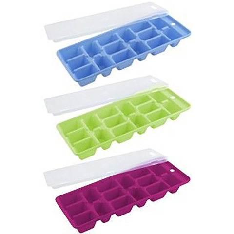 A Fackelmann fedeles jégkockakészítő kb. 15 jégkocka számára kínál helyet és mosogatógépben mosható. Kék, zöld és lila színben kapható.