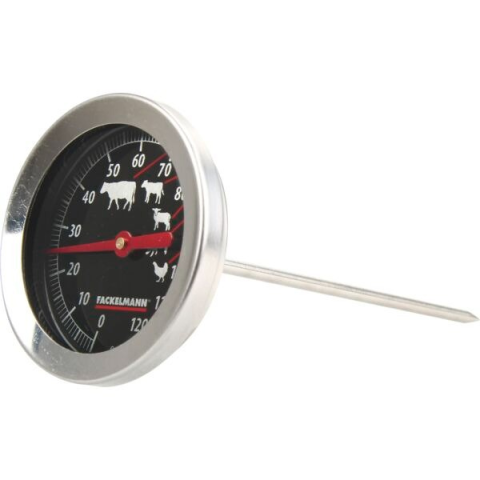 Fackelmann rozsdamentes sütőhőmérő a hús hőmérsékletének pontos ellenőrzéséhez. Mérési tartomány: 0 °C-tól +120 °C-ig. Ideális segédeszköz marha-, sertés-, bárány- és szárnyashús sütéséhez.