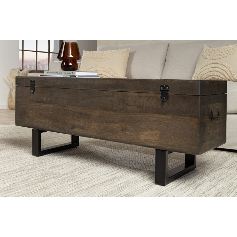 Dohányzóasztal - tárolóláda Unity Loft 115 cm mangó taupe barna A Unity Loft dohányzóasztal / tárloló láda eredeti kialakítás és a funkcionalitás lenyűgöző kombinációja. Tömör mangófából készült taupe barna kivitelben. A fekete fém sínek és fogantyúk ind