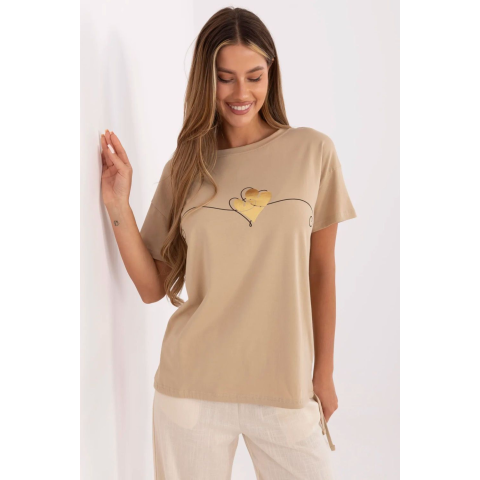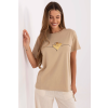 Női Póló Factory Price MM-213282. Színe: Barna Állj a kényelem és divatos megjelenés mellett a mindennapi viselethez tökéletes női pólónkkal. Kiváló minőségű pamutból készült, elasztánnal kiegészítve, biztosítja a tökéletes illeszkedést és a mozgásszabadságot. A standard hosszúságú modell rövid ujjakkal minden napra megfelelő lesz. A pólót az eredeti nyomtatás az elején és a bal oldalon lévő finom kötés teszi k