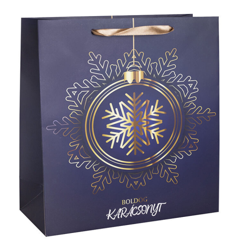 1 kép Fakopáncs Ajándéktasak - kicsi (kék alapon, arany gömbdísz)
