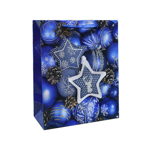 1 kép Fakopáncs Ajándéktasak - kicsi (kék karácsonyi díszek. középen fehér-kék csillag dísszel)
