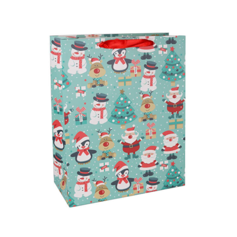 1 kép Fakopáncs Ajándéktasak - kicsi (türkíz alapon fenyőfák, hóemberek, rénszarvasok)