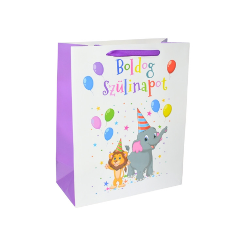 1 kép Fakopáncs Ajándéktasak - közepes (boldog szülinapot, elefánt és oroszlán)
