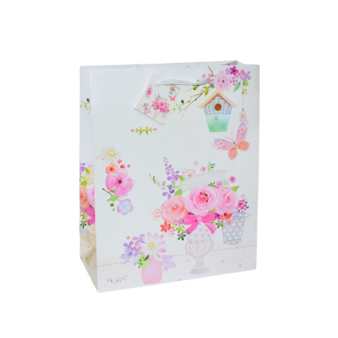 1 kép Fakopáncs Ajándéktasak - közepes (fehér alapon, rózsák vázában és madáretető)