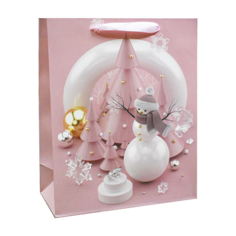 1 kép Fakopáncs Ajándéktasak - közepes (fenyőfák és hóember dekoráció mályva színű háttérrel)