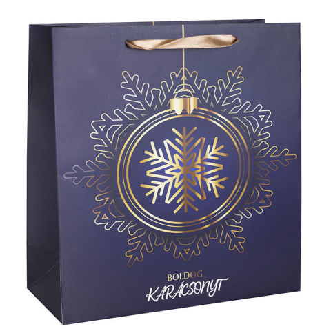 1 kép Fakopáncs Ajándéktasak - közepes (kék alapon, arany gömbdísz)