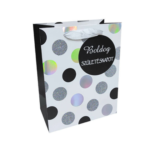 1 kép Fakopáncs Ajándéktasak - közepes (születésnapos, fehér alapon szürke és fekete pöttyök)
