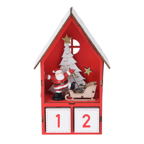 1 kép Fakopáncs Dekorációs figura, adventi naptár LED világítással (piros házikóban Mikulás és szánja)
