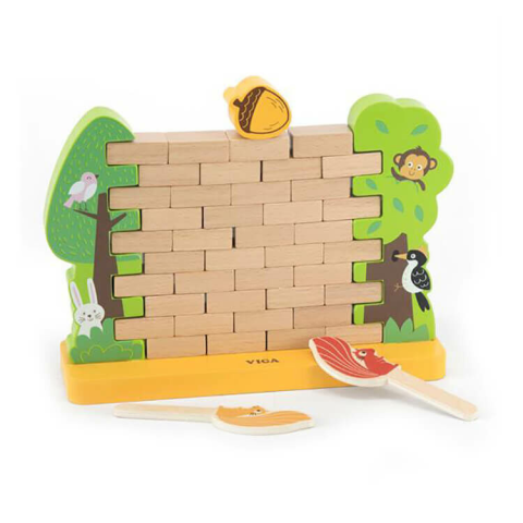 Egy 2 fős Wall játék, amelyben speciális pengékkel kell téglákat kicsúsztatni a falból, amíg egy korábban elhelyezett fa makk le nem esik. A készlet tartalmazza : - Fal alap - 40 tégla - 1 makk - 2 pálca a téglák mozgatásához A termék 3 év feletti gyerm