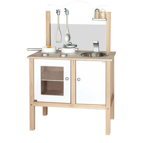 Ez a fehér fa játékkonyha valósághű konyhai környezetet teremt, ahol a gyerekek játékosan próbálhatják ki a sütés-főzés lépéseit. A kreatív szerepjáték során fejlődik a fantáziájuk, kézügyességük, kíváncsiságuk és képzelőerejük, miközben saját kis „étterm