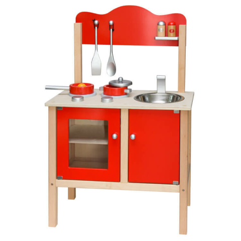 Ez a piros fa játékkonyha valósághű környezetet teremt, ahol a gyerekek kedvükre „főzhetnek” és „süthetnek”, miközben természetes módon fejlődik kreativitásuk, kíváncsiságuk és kézügyességük. A konyhai jelenetek eljátszása közben a képzelet szárnyra kap,