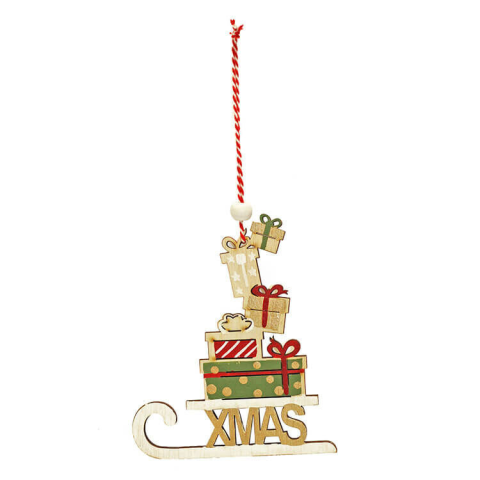1 kép Fakopáncs Karácsonyi dekoráció (fehér szánkó ajándékokkal és Xmas felirattal)