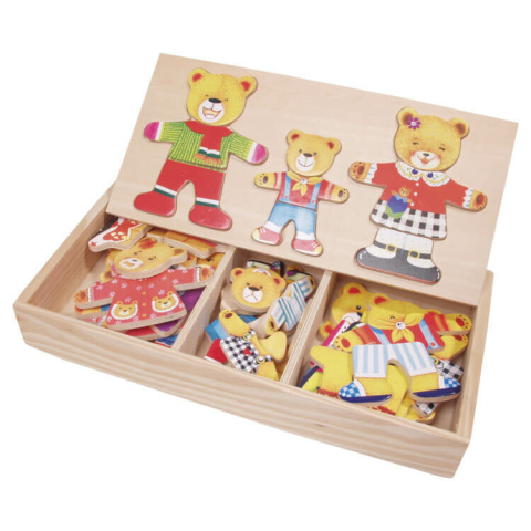 Ez a három darabos öltöztethető macicsalád kiváló eszköz a korai fejlesztéshez, mely 54 elemet tartalmazó fadobozban érkezik. A játék alapvető célja, hogy a gyerekek megtanulják azonosítani és a helyükre illeszteni a maci család különböző testrészeit és r