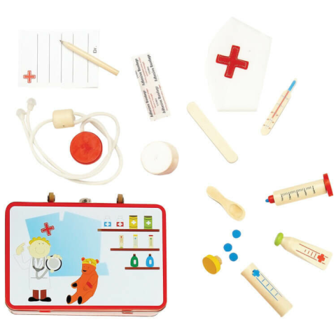 Fedezze fel modern és izgalmas játékainkat, vásárolja meg termékünket kényelmesen webáruházunkból! Orvosi játék készlet fém bőröndben, a legszükségesebb egészségügyi kellékekkel (sztetoszkóp, receptek, fecskendő, lázmérő, gyógyszerek). Termékméret:20x7x13