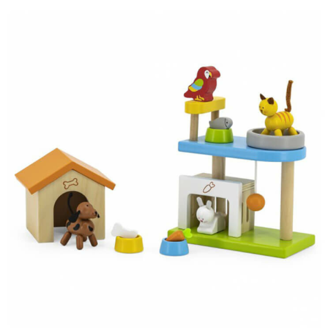 Bemutatjuk a VIGA fából készült játékát - az Állatok készletet. A készlet 4 háziállatot (kutya, macska, nyúl, papagáj) ábrázoló fafigurából, valamint az etetéshez (tálak és étel) és az alváshoz (kutyakennel a kutyának, ház a nyúlnak, ágy a macskának és bo