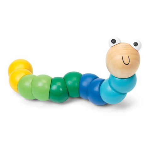 Fedezze fel modern és izgalmas játékainkat, vásárolja meg termékünket kényelmesen webáruházunkból! Fából készült színes babajáték. Könnyedén tekerhető és csavarható a tizenegy elemből álló kukac. Fejleszti a szem-kéz koordinációt és a finommotorikus készs