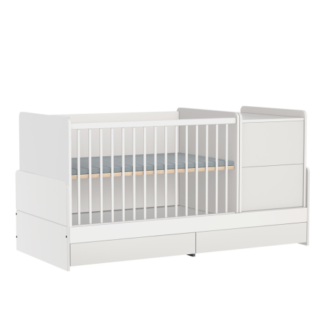 5 az 1-ben kombi babaágy. Teljes értékű babaágy 70 x 120 cm-es belső mérettel és egy 70 x 50 cm-es pelenkázóval, amit később szerszámok nélkül szétszedhetünk egy hagyományos babaággyá és egy komóddá úgy hogy a nagy tesónak már marad egy teljes értékű 180