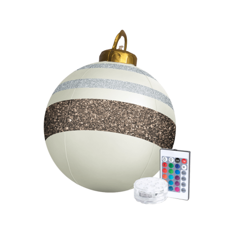 A karácsonyi időszak legújabb, innovatív dekoreszköze a felfújható, megvilágítható díszgömb. Nagy méretének köszönhetően elhelyezhető nagyobb kertekben is, fára akasztva vagy akár medence vízfelszínén is jól mutat. A díszgömb aljába rakható LED-es egység, csodálatos fénnyel világítja meg a gömb belsejét. A LED-ek energiaellátásáról 3 x AAA elem gondoskodik. Az Önnek tetsző világítási módot a tartozék távirányító segítségével állíthatja be. E