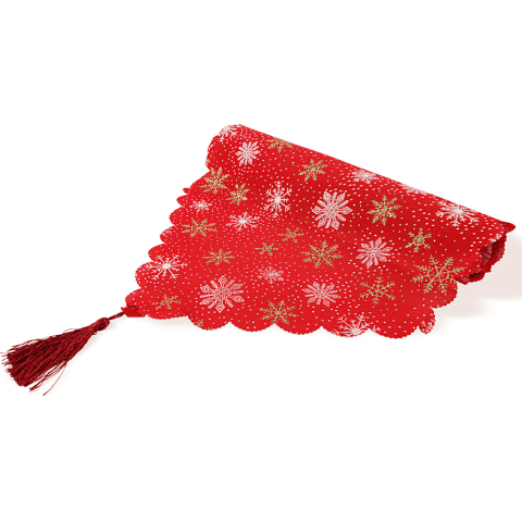 Az ünnep közeledtével fontos, hogy díszbe öltöztessük otthonunkat is. Dekorálja asztalát ezzel a karácsonyi asztali futóval az ünnepi vacsora alkalmából. Piros alap / fehér arany minta Poliészter anyagból