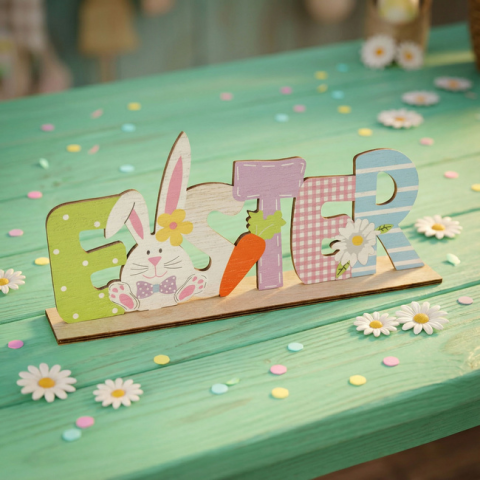 Family Húsvéti fekvő asztaldekoráció fából - nyuszis, 57968ADobja fel ünnepi asztalát ezzel a vidám, nyuszis húsvéti dekorációval A fából készült fekvő asztaldísz színes betűkkel formázza az "EASTER" feliratot, amelyet aranyos nyuszi, répa és tavaszi virágok díszítenek. A dekoráció könnyedén elhelyezhető asztalon, polcon vagy komódon, és azonnal ünnepi hangulatot teremt otthonában. Tartós fa anyagának köszönhetően hosszú ideig megőrzi szépségét, íg