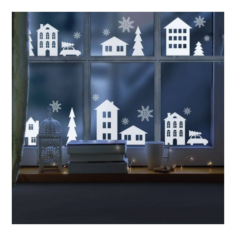 Karácsonyi ablakdekor - téli táj - 37,5 x 27 cm Vidám, karácsonyi ablakdekor az ünnepi hangulat megteremtéséhez. Könnyen felragasztható és nyom nélkül eltávolítható. A matrica egyes részei glitterrel díszítettek. Öntapadós Glitteres Havas téli táj