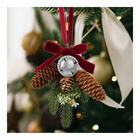 A dísz alapját egy műfenyő ág alkotja, amely tobozzal, csillogó ezüst színű csengettyűvel és szalaggal van dekorálva. A műfenyő á