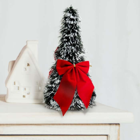Karácsonyi, asztali műfenyő - havas - 2 piros masnival - 26 cm Díszítse otthonát, irodáját a szeretet ünnepén is. Ha nappalija nem elég nagy egy valódi karácsonyfának, az asztalra helyezhető mini műfenyő tökéletes alternatíva lehet. Formás, karcsú alak